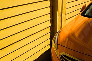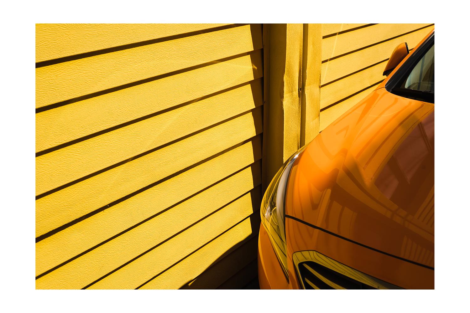 An orange taxi pauses beside a yellow wooden wall, where vivid colors and textures meet in a contemplative urban scene.