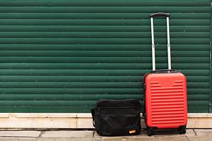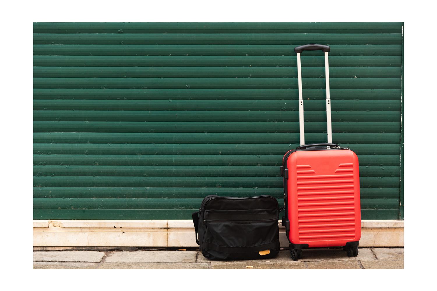 Red luggage and a black briefcase rest by a green iron gate on a Venetian street, their colors and textures capturing a quiet pause in transit.