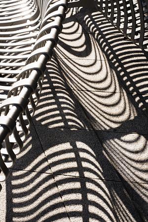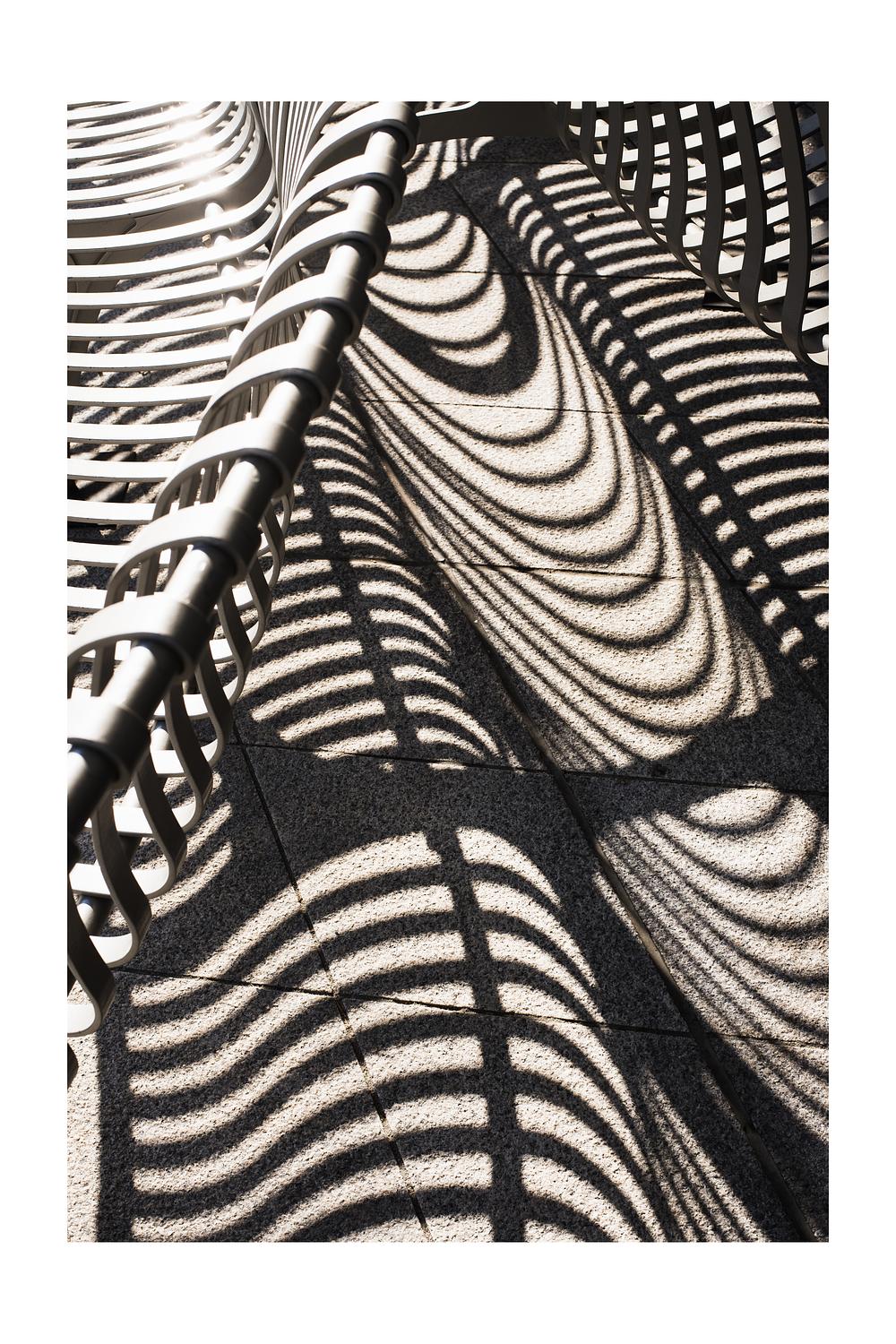 Sunlight traces a curved bench, casting sculptural shadows that bring quiet stillness to the urban street.