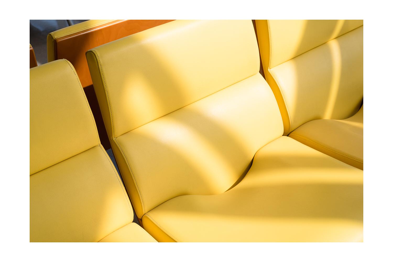 A yellow chair glows under sharp sunlight, casting bold highlights and soft shadows in the quiet airport space.