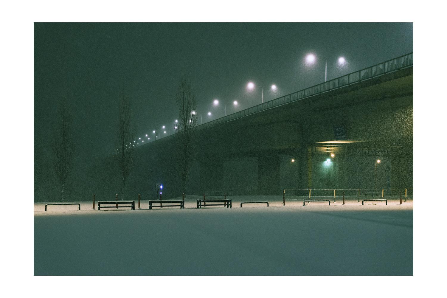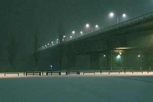 A snowstorm veils the bridge under a silent winter night. Streetlight glows softly through the blizzard, revealing solitude and structure.